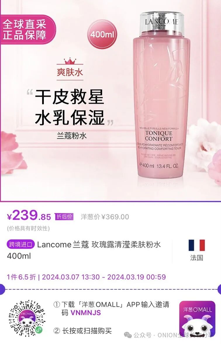 「兰蔻粉水400ml*2」干皮救星,一瓶肌肤喝饱水。蕴含槐花蜜+扁桃精粹,舒缓润养。1件6.6折,活动到手价¥461.34
