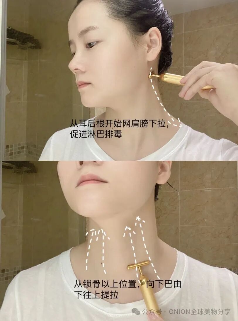 功效1:淋巴排毒。24K金美容棒采用24K纯金打造,从面部给予细胞微弱电流,打通脸部淋巴循环,促进废弃物的排除,排出多余毒素