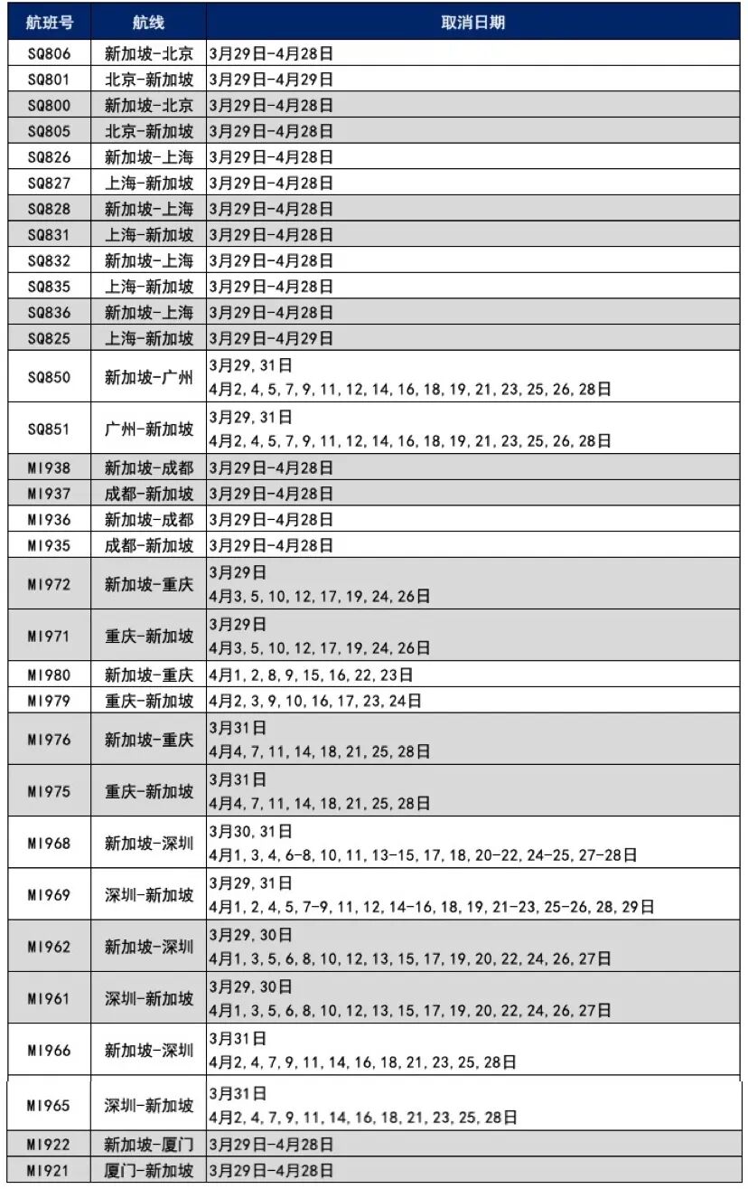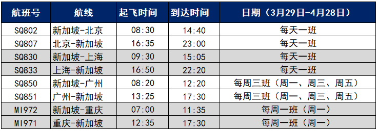 尽管需求量减少,目前在2020年3月29日至4月28日期间,我们依然会继续北京、上海每天一班、广州每周一、周三、周五各一班,以及重庆每周一往返新加坡的少量航班服务,以便为有切实出行需求的乘客提供服务。北京、上海、广州受航班取消影响的乘客将会收到通知,并被妥善安排至其他仍在运营的航班。受航班取消影响,原计划于周二、周日搭乘重庆往返新加坡航班的乘客将被妥善安排至周一的航班。原计划于周三、周四、周五、周六搭乘重庆往返新加坡航班的乘客可以联系原购票渠道办理退改签。