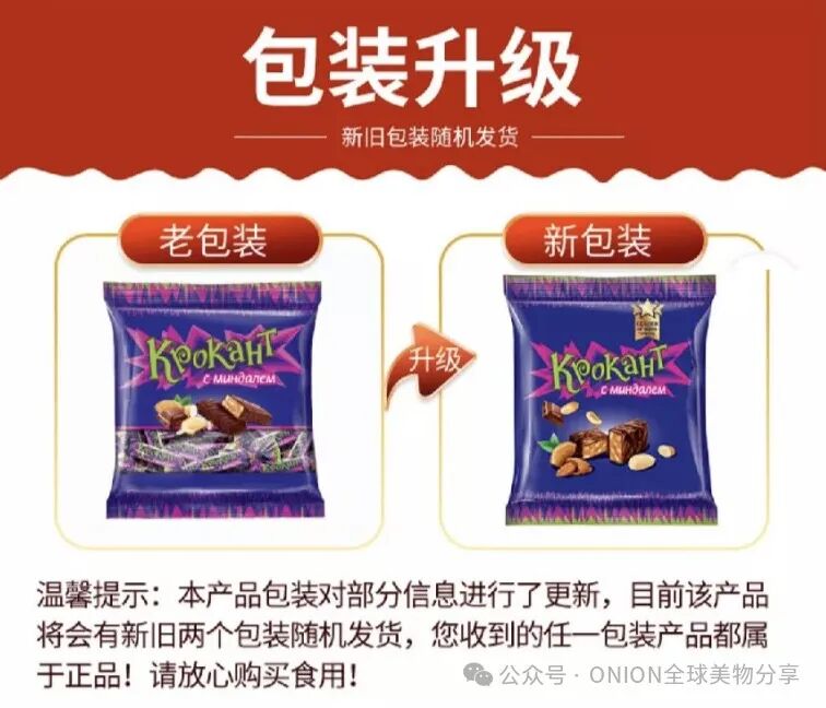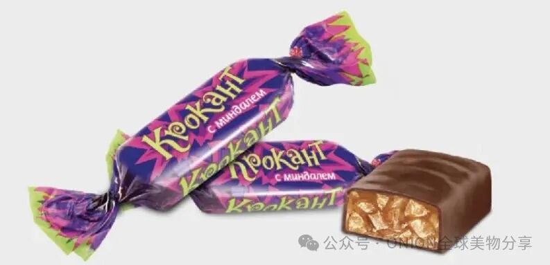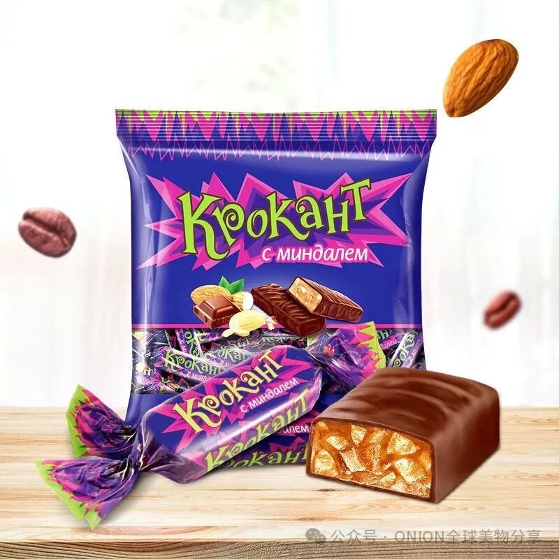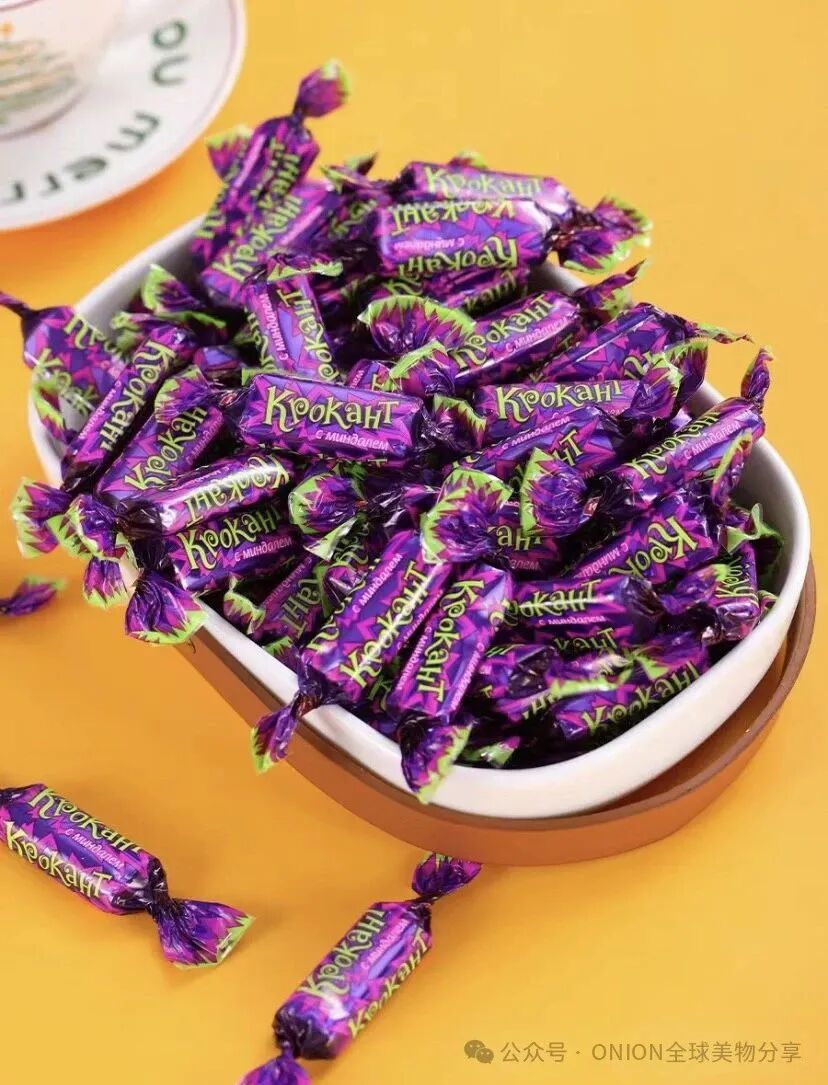 整体包装是紫绿配色,糖皮上写着 крокант с миндалем,而不是什么ХУНЧАН、MudgYtg、KlmlGong啥的看起来像是俄语实际上四不像的字母~