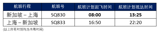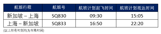 因运营调整,自2021年8月30日起至2021年9月27日止,新航SQ830航班,由新加坡飞往上海浦东机场的起飞时间将提前至上午8时整;而由上海浦东飞往新加坡的新航SQ833航班时刻则保持不变。