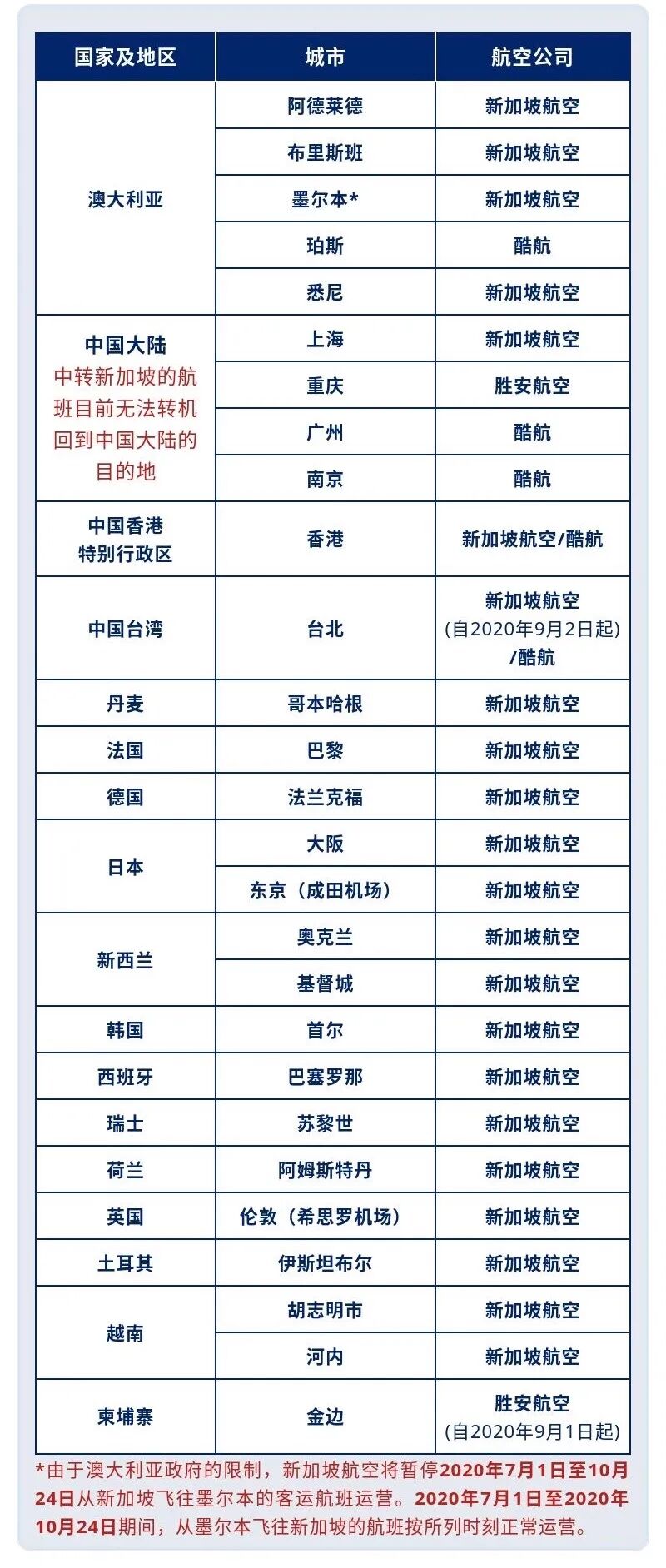 *注:台北是在较早前获批的酷航航班基础上,新增新加坡航空航班,并于2020年9月2日起生效。