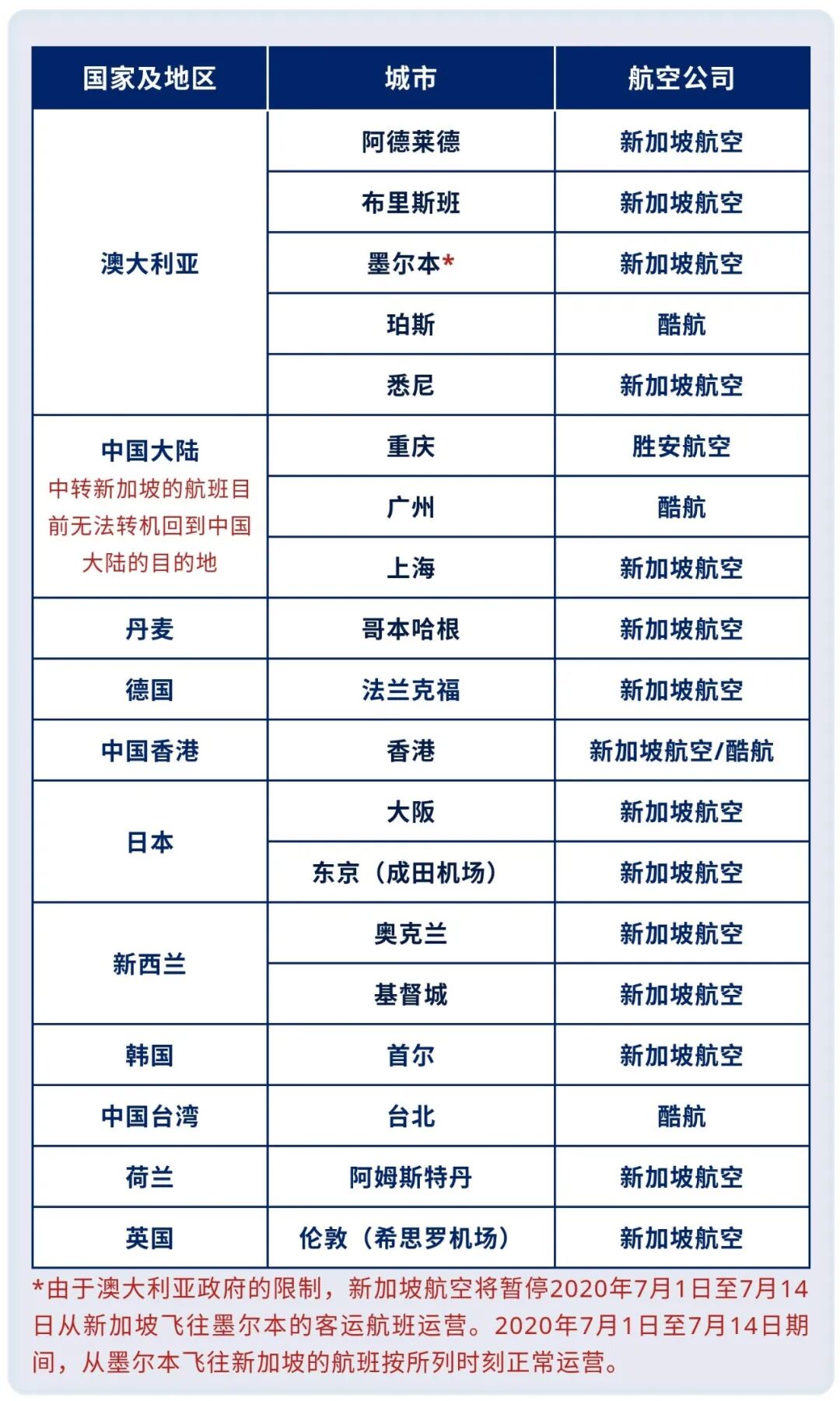 1.自2020年6月29日起,搭乘新加坡航空及胜安航空的航班,从阿姆斯特丹、哥本哈根、法兰克福、伦敦(希思罗机场)始发的乘客可以经新加坡樟宜机场中转,前往新航集团航线网络中新加坡航空、胜安航空或酷航正在运营的除中国大陆以外的任意目的地。这些是早前获批的澳大利亚、中国大陆、中国香港、日本、新西兰、韩国及中国台湾指定始发航点之外的新增指定城市。