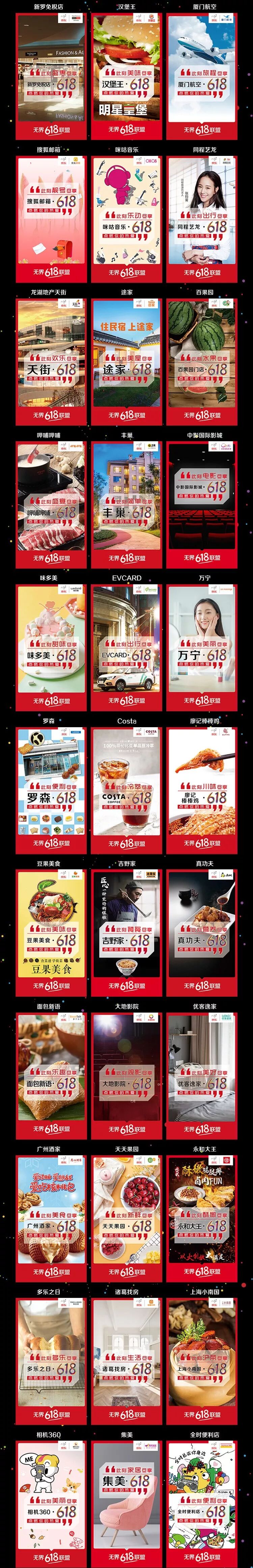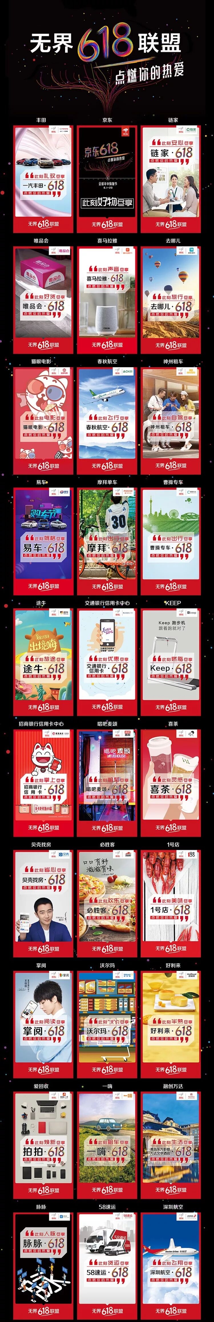 到今年,618更是再升一级,用“无界618联盟”为消费者带来了一个囊括了线上线下众多平台、品牌和商家的“年中狂欢盛宴”,涵盖了衣、食、住、行、运动、娱乐、金融服务等日常生活的方方面面——既有极高人气的喜茶、唱吧等新生代网红品牌,也有沃尔玛、汉堡王等全球知名连锁品牌,还有唯品会、去哪儿、易车、途牛等线上平台。