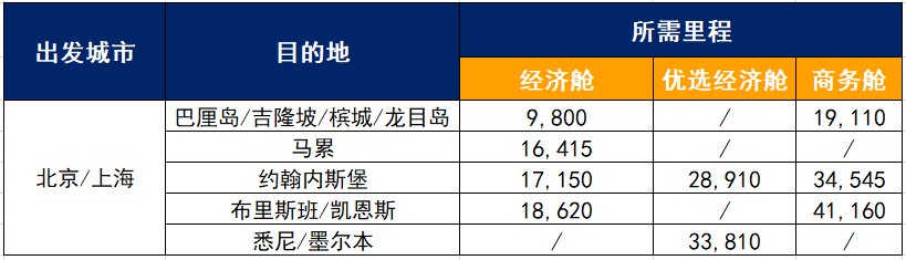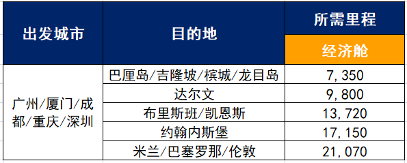 *以上列表所标注的里程数,是在使用里程兑换机票时,每人每单程所需的KrisFlyer里程。