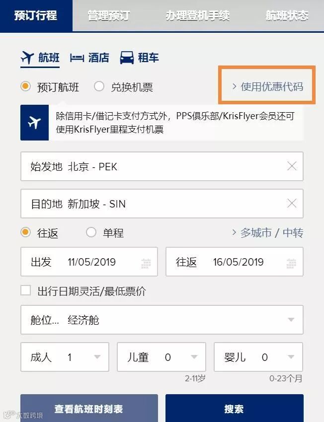 登陆新航官网,在首页或搜索航班页面输入优惠码SGDAY2019,在预订中国大陆往返新加坡的航班时,即可享受专属优惠!(优惠码仅限官网购票使用,不适用于APP购票)