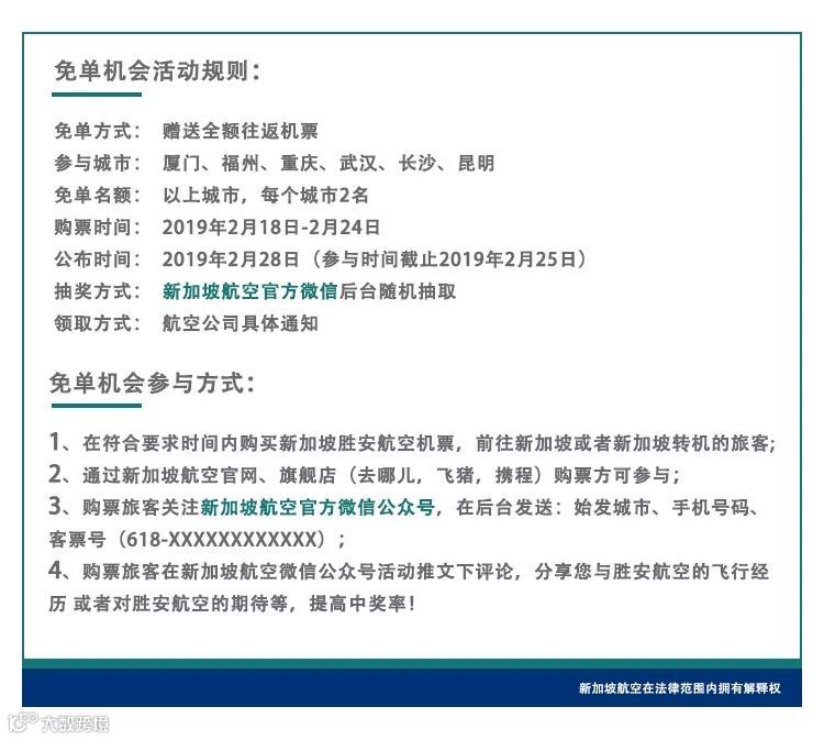 只要在促销时间内,通过官方渠道购买了胜安机票前往新加坡或于新加坡转机,将你的“始发城市、手机号、客票号(618-xxxxxxxxxxxx)”发送至新航微信后台,即可参与抽奖赢取“免单”机会!