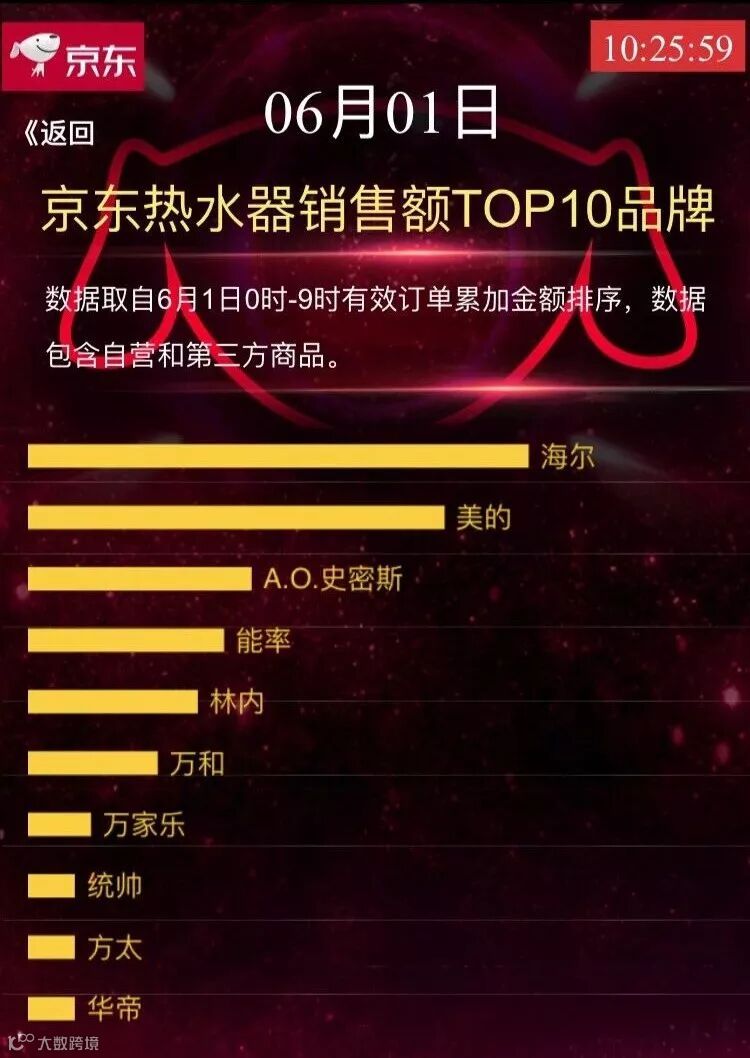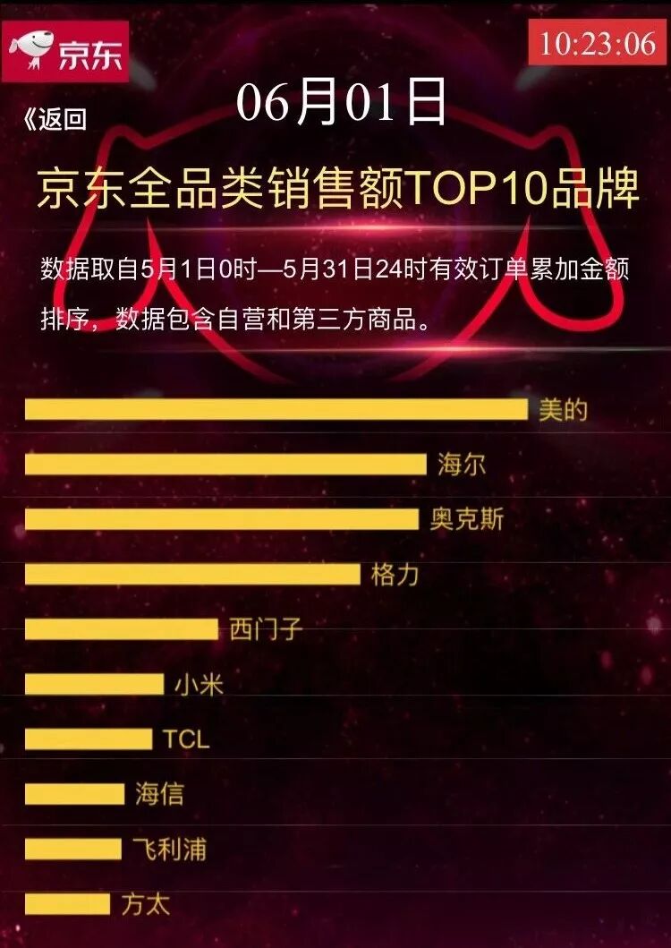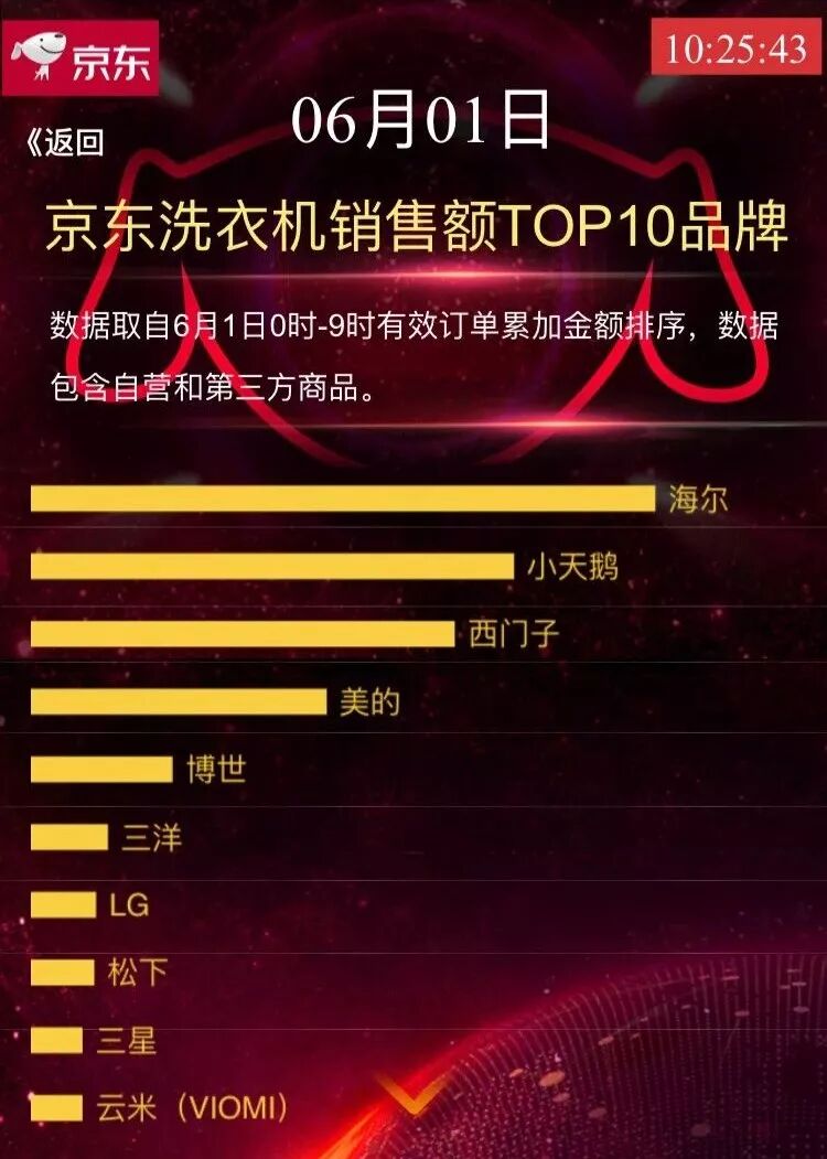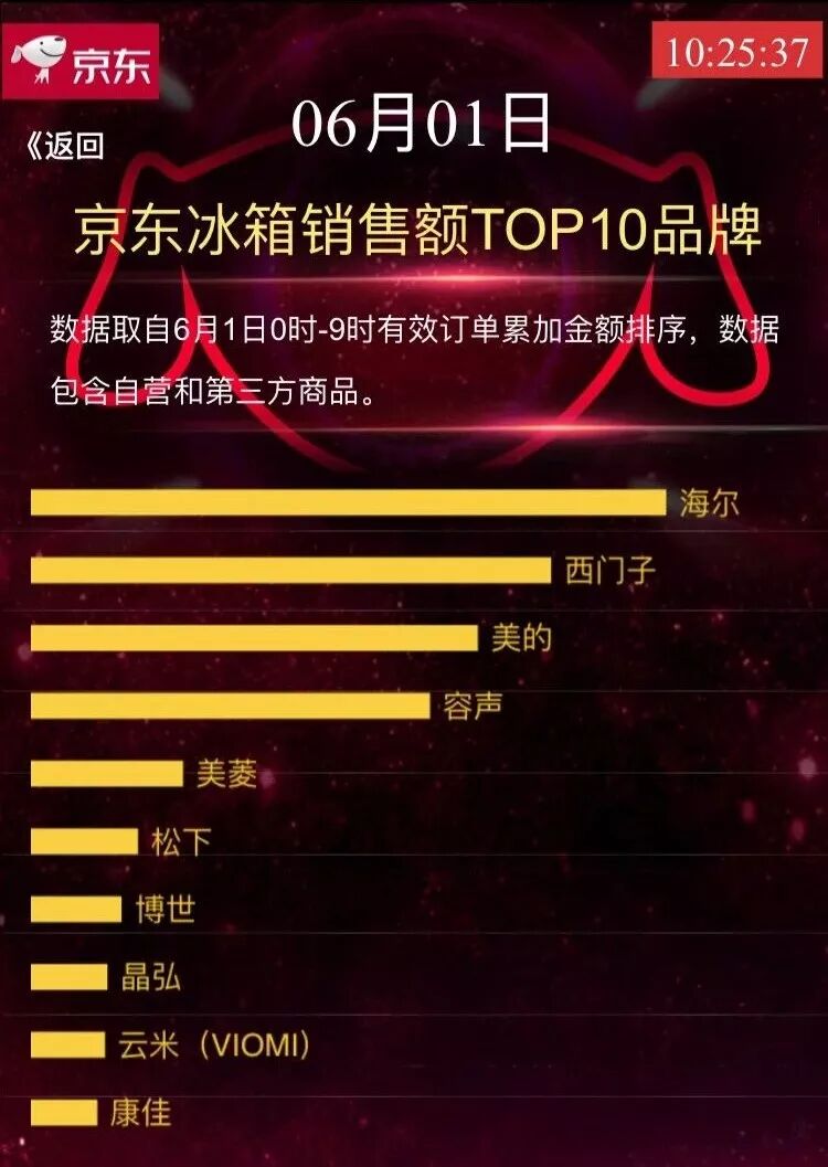 从0时抢购开始,京东家电各品类销售全面暴涨,冰洗品类43秒就销售过亿,仅用6分钟家电全品类销售就突破10亿元。高潮迭起、销售额不断攀升,遥领先于其它家电零售渠道,展现出主场的王者霸气。