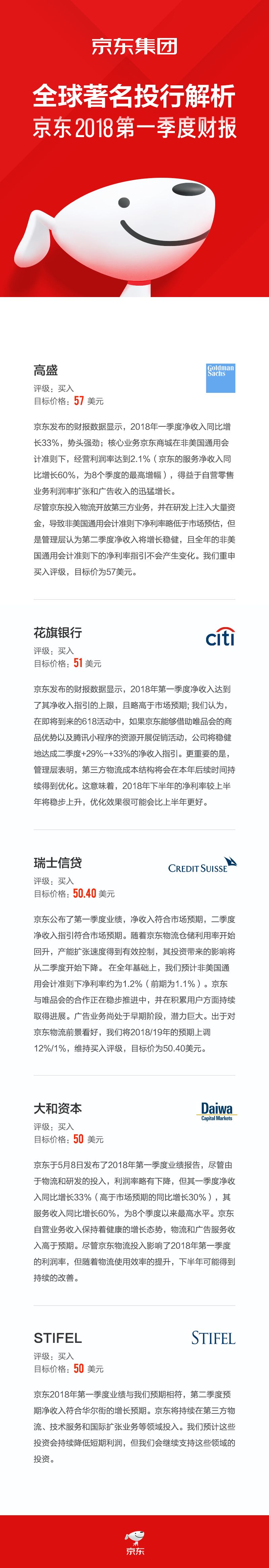 瑞士信贷:京东公布了第一季度业绩,净收入符合市场预期,二季度净收入指引符合市场预期。随着京东物流仓储利用率开始回升,产能扩张速度得到有效控制,其投资带来的影响将从二季度开始下降。京东与唯品会的合作正在稳步推进中,并在积累用户方面持续取得进展。广告业务尚处于早期阶段,潜力巨大。出于对京东物流前景看好,我们将2018/19年的预期上调12%/1%,维持买入评级,目标价为50.40美元。
