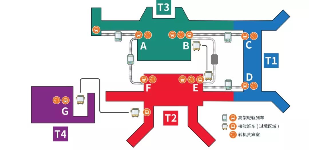 *目前T2航站楼和T3航站楼之间的北线高架轻轨列车因施工暂停运营。