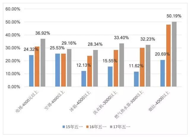 ▲ 2015—2017年京东五一促销节高端家电销售额占比情况
