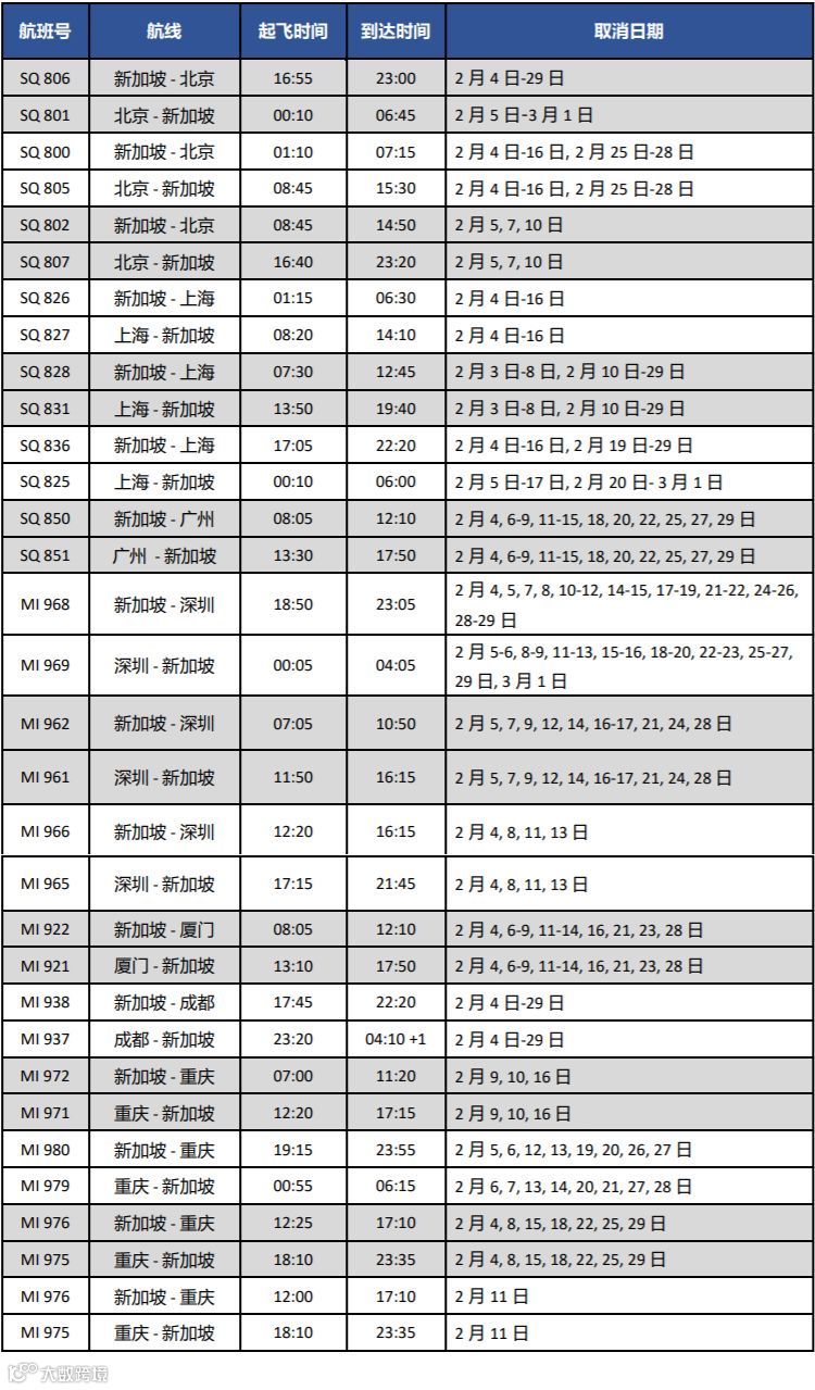 新加坡航空及胜安航空一直密切关注着中国地区的新型冠状病毒肺炎疫情,鉴于对目前疫情发展状况的评估,新加坡航空及胜安航空决定于2020年2月,暂停部分新加坡往返中国大陆航班的运营,截止到2020年2月1日,最新航班取消信息如下:
