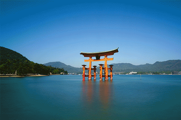 宫岛又称严岛,位于广岛西南部。这里是广岛之旅最不能错过的地方,不仅因为它是著名的“日本三景”之一,更因为那点缀在美丽的濑户内海上的严岛神社,它建立于公元6世纪,古时被尊奉为“海上守护神”。神社前约200米的海中,则是宫岛的标志性地标—红色大鸟居,每当涨潮时,被海水半淹着的大鸟居,就像漂浮在海面一般,神秘而壮观。