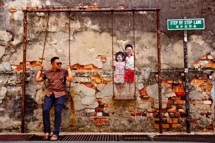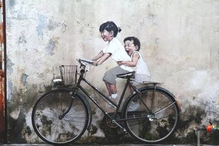 壁画全部以真人真事为题材,带着马来西亚特有的生活气息。看看这幅“姐弟共骑”,你也被他们生动活泼的表情感染了吗?这两姐弟其实并非虚拟,而是真有其人:在一次偶然的机会下,两姐弟在自行车上玩乐的瞬间,被尔纳斯用镜头捕捉下来,并画成壁画。想不想和你的小伙伴,在“他们”旁边来一个逗趣的摆拍?