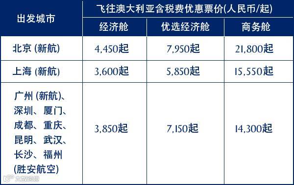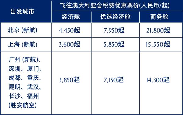 随新航飞往美丽的澳大利亚,从旅途就开始享受无懈可击的完美假期。令人心动的机票价格包括至少30公斤行李额度,以及精心设计的机舱餐点。超过1000种机上娱乐选择,从最新电影、电视节目、音乐到电玩,让您一路尽兴,前往更多您向往的目的地,这就是新航不辞千里、诚觅尽美之道的体现。
