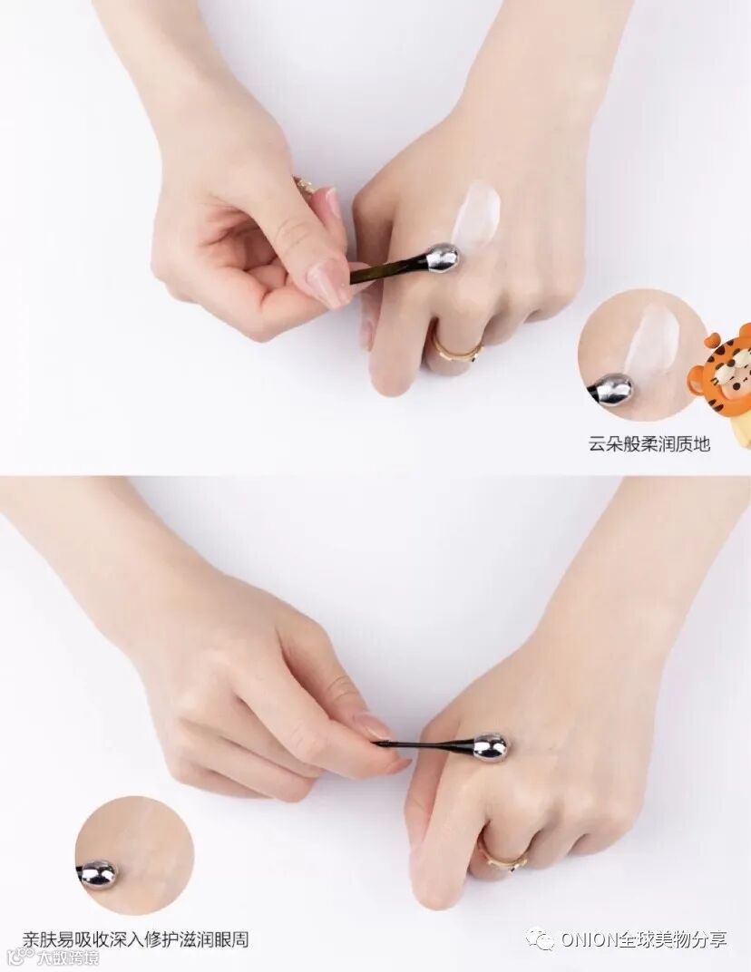 配套的按摩棒一定记得要使用!能促进吸收,还能紧致提拉眼部,每天坚持按摩几圈效果更佳!用前提前放到冰箱里,然后用它在眼周按摩和提拉,眼霜整个的吸收度和使用感会更舒服,试试看喽!