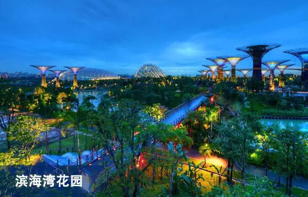 新加坡滨海湾花园中的18棵擎天大树可是新加坡最著名的地标之一。两棵擎天大树之间有空中步道相连,白天可以攀上树顶,体验在树梢上漫步的感觉,傍晚则可以欣赏灯光秀,五彩灯光和投射灯将这座垂直花园打扮得妖娆多姿。