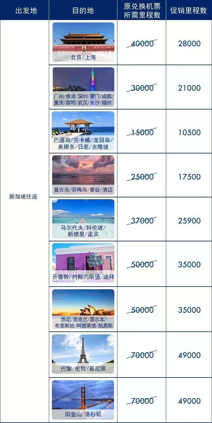 (以上里程数为兑换经济舱往返机票所需里程。您也可以选择兑换以上任一目的地的单程机票,所需促销里程数减半。)