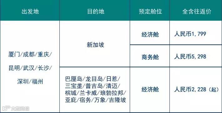 新加坡出发:请拨打(65) 6223 8888电话联系新加坡预订处进行查询以及预订。