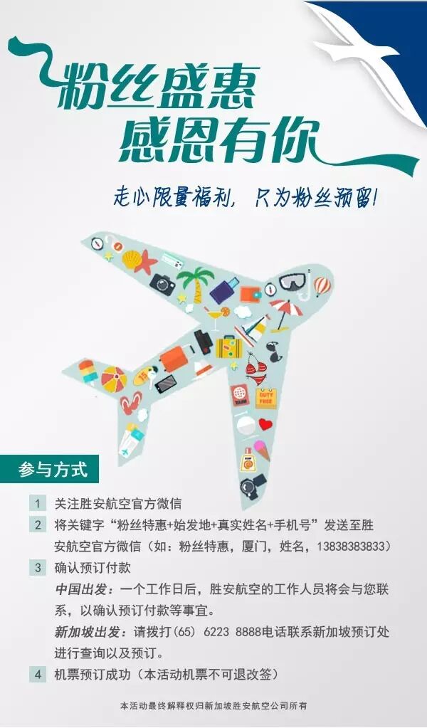 2. 中国出发:将“粉丝特惠,出发地,手机号”发送至胜安官方微信(如:粉丝特惠,厦门,13838383833)
