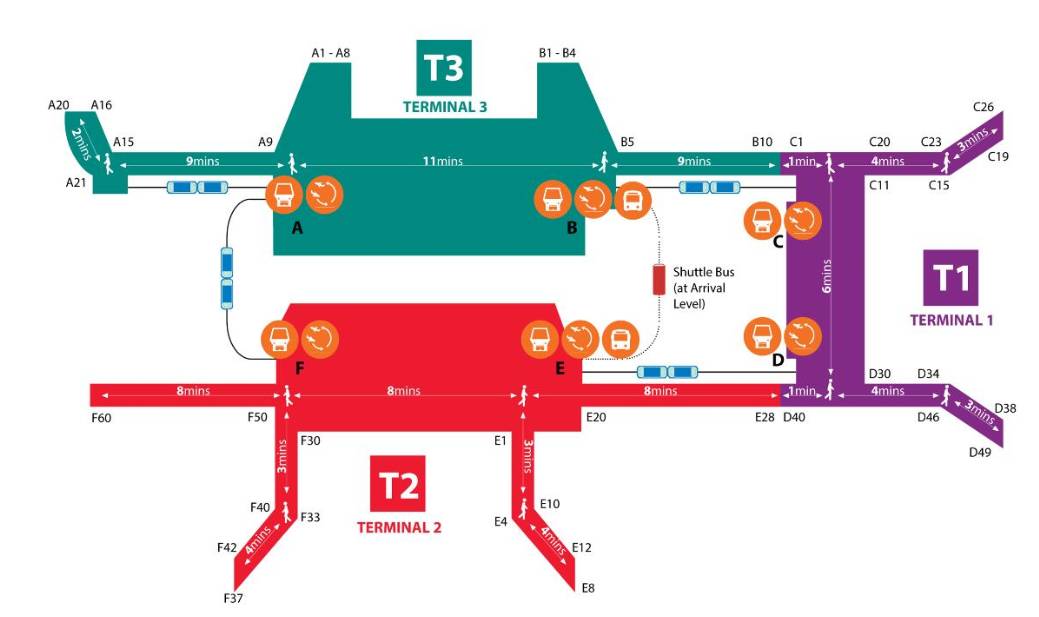 樟宜机场分为T1、T2、T3三区,您可免费乘坐高架轻轨列车往返于樟宜机场的航站楼之间。列车的运营时间为早上 5:00 至凌晨2:30,转机区和公共区均可搭乘。
