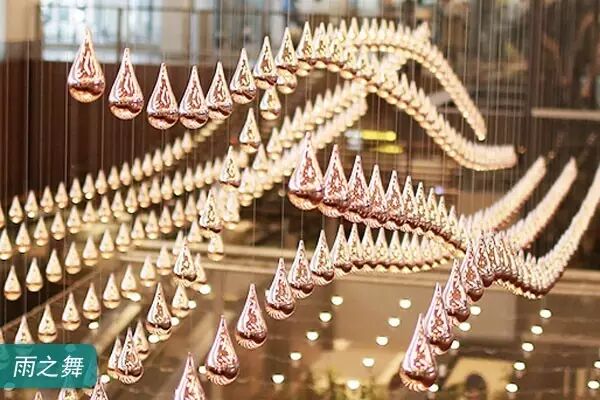 “雨之舞”是全球最大型、也是最复杂的动态雕塑,由1216颗水滴组合而成,每个水滴都连接至一个发动机,可以变幻出16种不同的形状:从抽象的艺术造型,到栩栩如生的飞机、热气球、风筝,甚至是龙的形态,每一次变幻都让人惊叹不已。