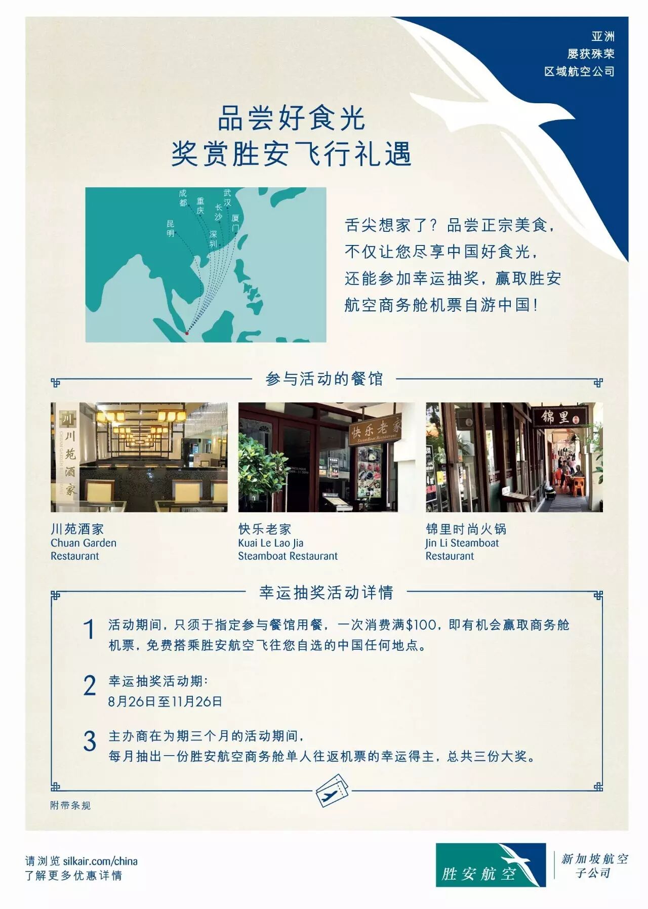 即日起—11月26日期间,在以下指定餐厅用餐,一次性消费满100新币,将有机会赢取商务舱机票哦,免费搭乘胜安航空飞往您心仪的中国目的地!