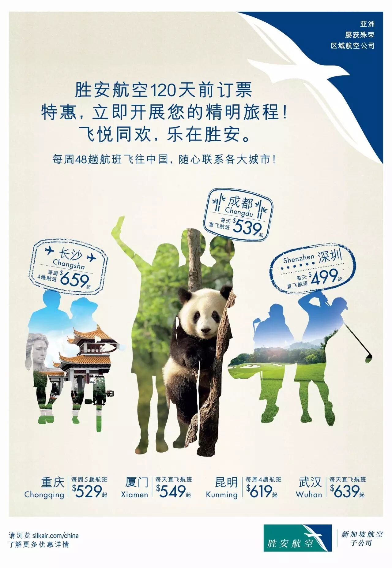 现在只要提前120天预订,前往中国七座魅力之城:长沙、成都、深圳、重庆、厦门、昆明、武汉,可以享受胜安航空的超值优惠哦~