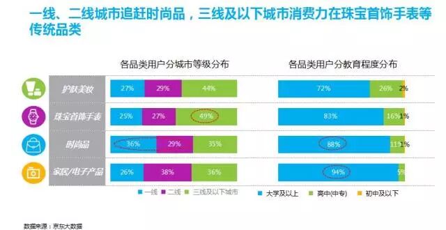 《报告》显示,目前国内各线城市在奢侈品消费上各具特点:一线、二线城市紧跟时尚潮流,在时尚品类和家居/电子产品品类上消费占比远高于三线以下城市。而三线以下城市则青睐于珠宝首饰、手表等传统奢侈品类。另外,从购买群体的受教育程度去分析,大学及以上学历的消费者占绝对优势比例。