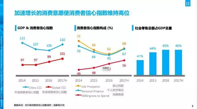 中国GDP持续增长,消费的驱动越来越强劲,尤其是网络零售增长明显。国家统计局数据显示,2017年1-9月份,全国网上零售额36826亿元,同比增29.1%。同时,尼尔森消费者信心指数数据显示,连续四年,中国消费者的消费信心指数高于全球平均水平,而消费信心指数则由消费者就业预期、个人经济情况及消费意愿几类指标构成。