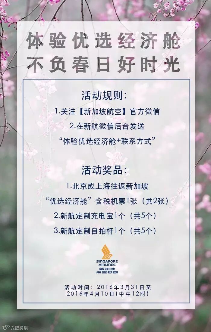铛铛铛,福利时间到!即日起至4月10日,关注【新加坡航空】官方微信,回复“体验优选经济舱+您的联系方式”至新航官方微信后台,即有机会获得新加坡往返含税机票1张!(共2张),还有更多精美好礼等你拿。拂面的微风带来芬芳的花香,在春色正浓的4月,就让我们一起出发吧!