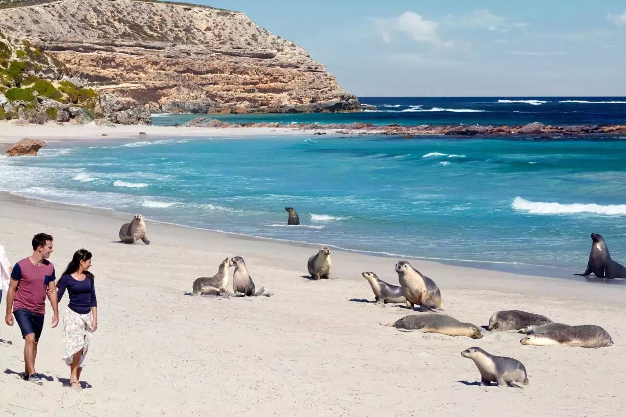 位于袋鼠岛南部海岸的海豹湾(Seal Bay)以其庞大的稀有动物群——澳大利亚海狮群而著称,这里是世界少数几个可以观看野生海狮的地方之一。从长长的木栈道走到沙滩上,到处都是海狮们的身影,游客可以与海狮在沙滩上近距离接触。目前,这里共有海狮约600头,它们极通人性,对于漫步在它们其中的游客们表现得相当大度;当面对镜头时,还会摆好姿势,非常合作地与游客们一同合影留念。