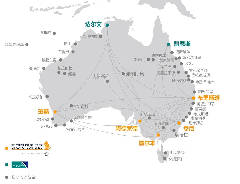新航/胜安航空及维珍澳洲澳大利亚航线网络
