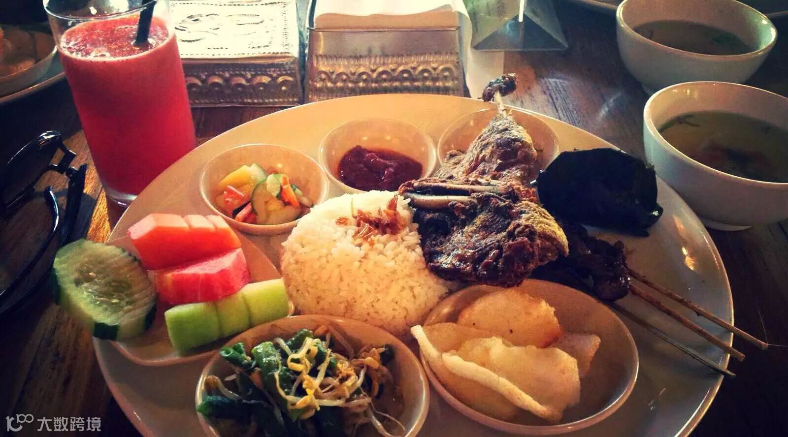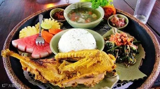 脏鸭餐是到巴厘岛必需品尝的特色美食之一,大家可不要被这名字骗了!脏鸭餐是必吃的一道经典美食!翠绿的酱碟,色彩鲜亮的原只烤鸭,再以绿色的青柠片和耍红的西瓜片作拌碟,丰富的配餐加上鲜亮的颜色,令人垂涎欲滴。