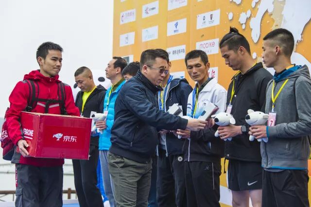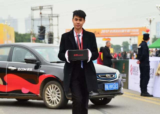 除了炫酷的无人机,京东物流还派出高颜值的“京尊达”配送员为比赛“配送”奖品。在男子、女子5公里项目颁奖仪式上,一位身着衬衣西装、戴着白手套的帅气小哥,捧着一个黑红相间的快递盒,从一辆新能源汽车上走下来,为颁奖嘉宾送上奖品。