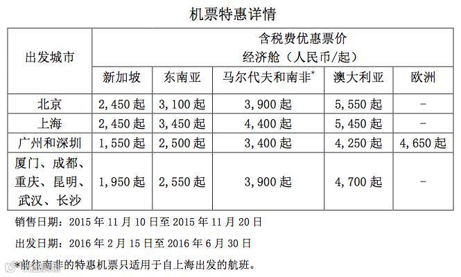 此外,新航还推出了“双十一”特惠机票,机票覆盖包括新加坡、东南亚、马尔代夫、南非、澳大利亚、以及欧洲的诸多精选城市。挑选一个心中的目的地,新航将以超值的价格和超品质的服务,带您随心畅游。自樟宜机场转机的新航旅客每人还可获得价值40新元的樟宜机场消费抵用券。