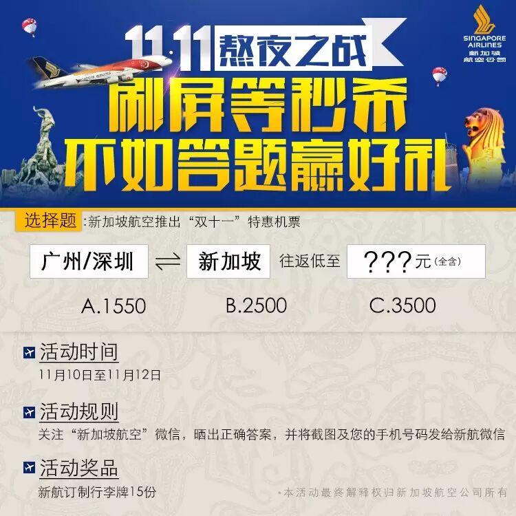 又到一年11.11,各类精选好物简直挑花眼。在这熬夜之战,与其刷屏等秒杀,不如关注“新加坡航空”微信,参与答题赢好礼活动。