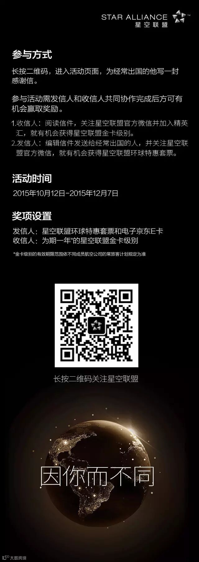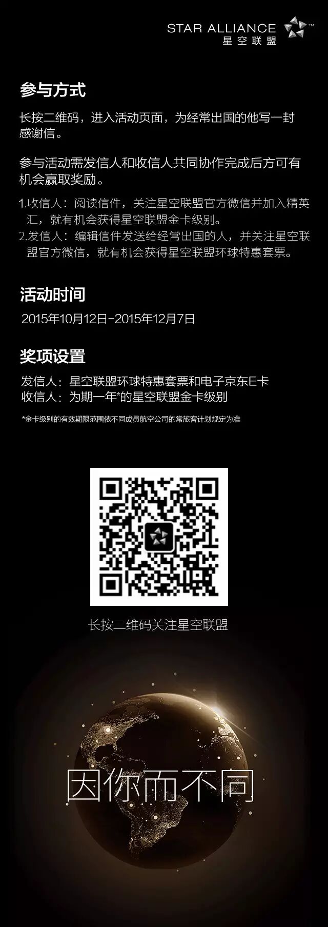 作为星空联盟成员航空,我们很高兴地通知各位尊敬的会员,星空联盟“因你而不同”活动已经开始,诚挚地邀请您参加。分享您的感受给身边经常出国的人,为他赢取星空联盟金卡级别,同时您也有机会获得两张环球特惠套票。