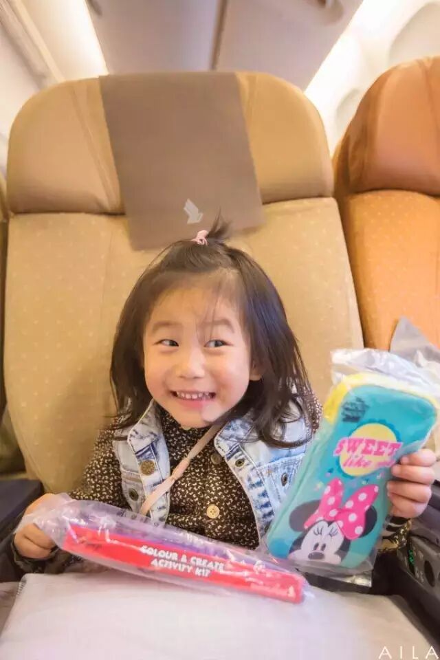 一上飞机,贝壳儿就收获了礼物,而且是她最喜欢的涂色本,小朋友太开心了。