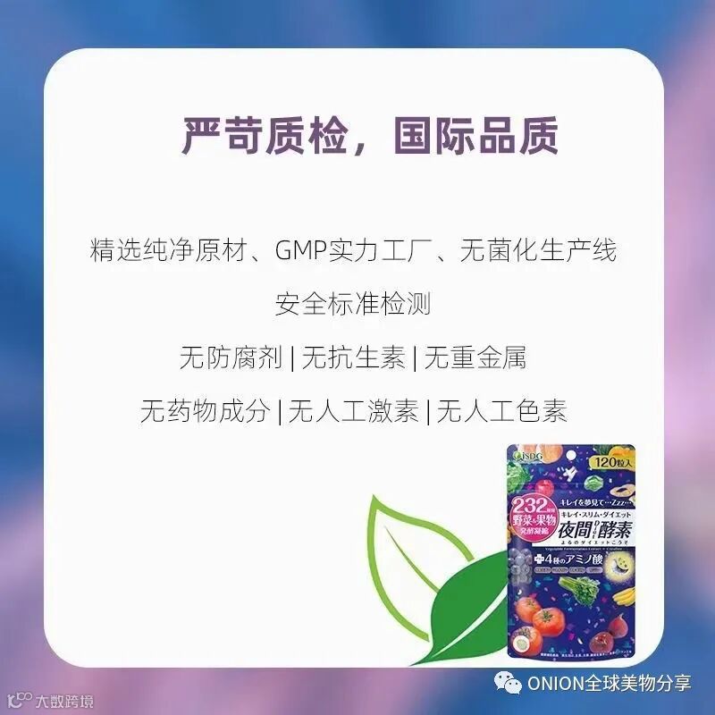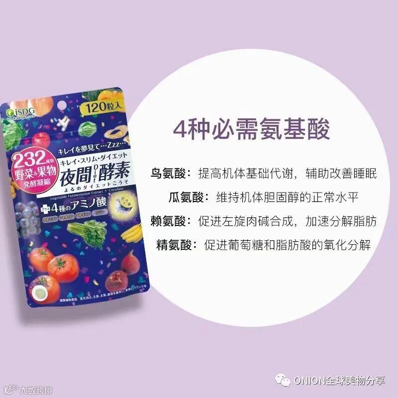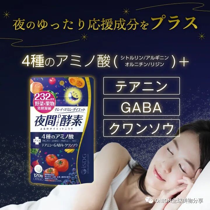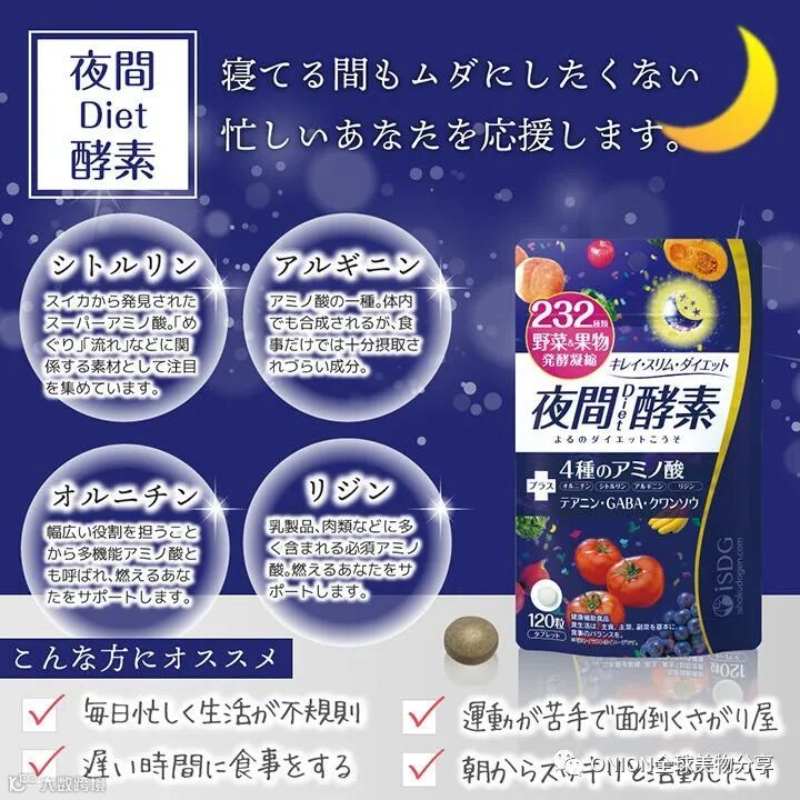 夜间酵素主要成分包括了232种蔬菜和水果、L-鸟氨酸盐酸盐、L-瓜氨酸、L-精氨酸以及L-赖氨酸盐酸盐、日本冲绳萱草粉末,这些成分由ISDG充分考虑塑身以及促进新陈代谢,平衡体内酸碱值等要求精心挑选搭配,在日本更是国民酵素,不仅不会给身体健康带来负担,反而有益于身心健康,是一款安全性很高的酵素产品。