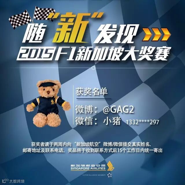 随“新”发现2015 F1新加坡大奖赛活动中奖名单出炉啦!恭喜下面两位幸运的新航粉丝,获得新航F1限量版小熊公仔~
