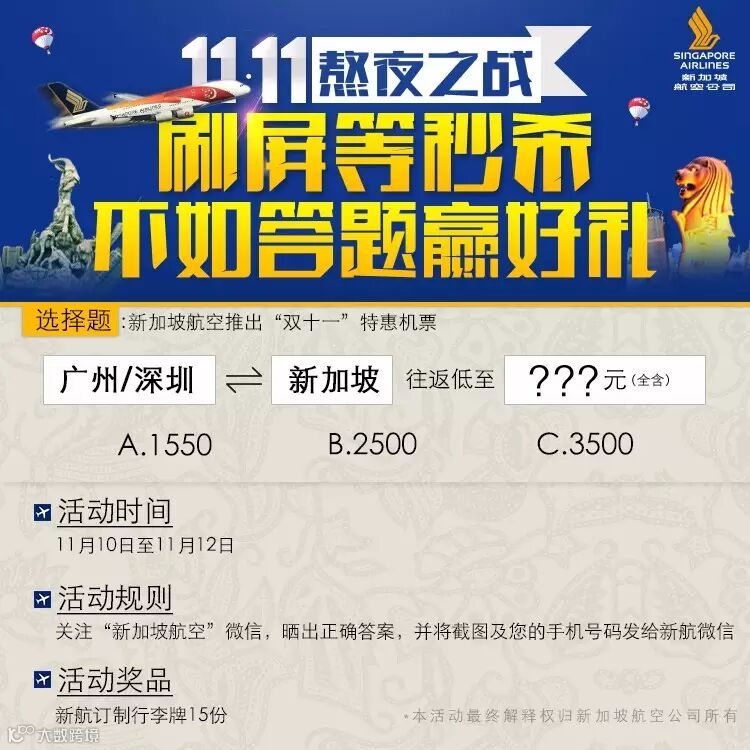 关注“新加坡航空”微信,晒出正确答案,并将截图及您的手机号发给新航微信,就有机会获得新航订制行李牌哦!活动截至时间为今天晚上23点59分,赶快行动起来,参与就有机会赢新航订制行李牌哦~