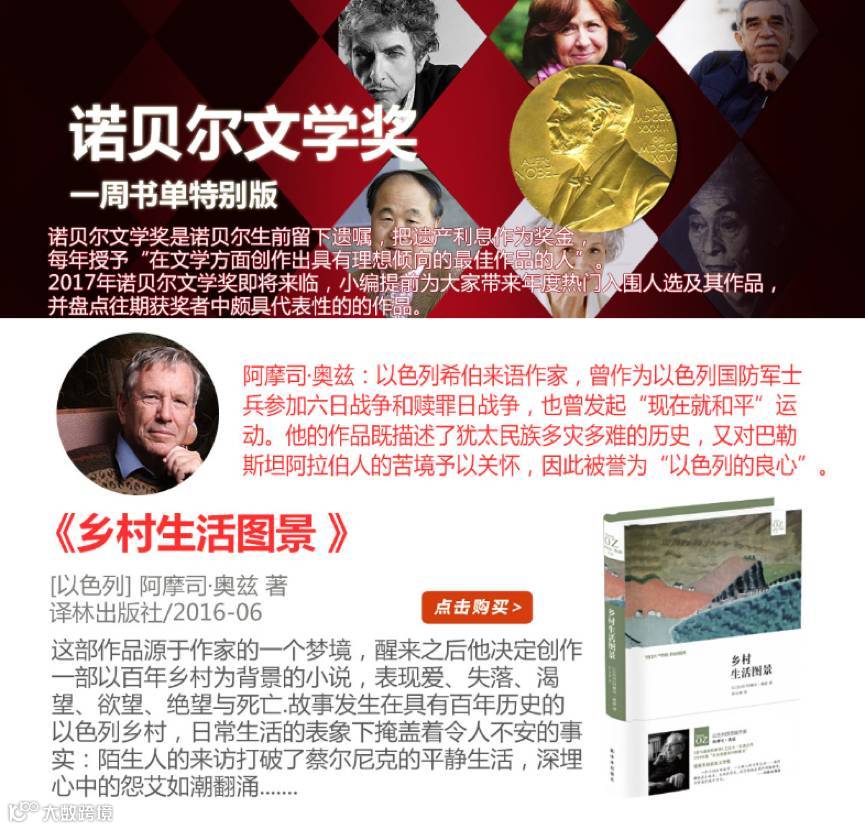 已经获得京东文学奖国际作家作品奖的以色列作家阿摩司·奥兹,一直被英国ladbrokes网站预测为本届诺贝尔文学奖的热门得主,今年遗憾的与诺奖失之交臂。结果的揭晓也在中国引发了热潮,新晋获奖者第一时间成为社交媒体热议话题,其原本销量平淡的得奖者著作也瞬间成为图书电商爆款。随着媒体分析书评等陆续发布推波助澜,“阅读诺奖经典”俨然成为国庆假期的新时尚。