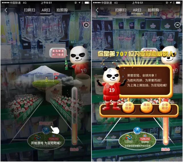 于是,一场主题为“亚冠荣耀”之战的AR活动在京东APP上线,通过京东APP首页左上方AR扫描功能,扫描青岛啤酒标识即可参与点球大战互动游戏,这也是青岛啤酒将“足球+啤酒”的主题节目从空中、海上、陆上发展到虚拟空间的一个重大举措。