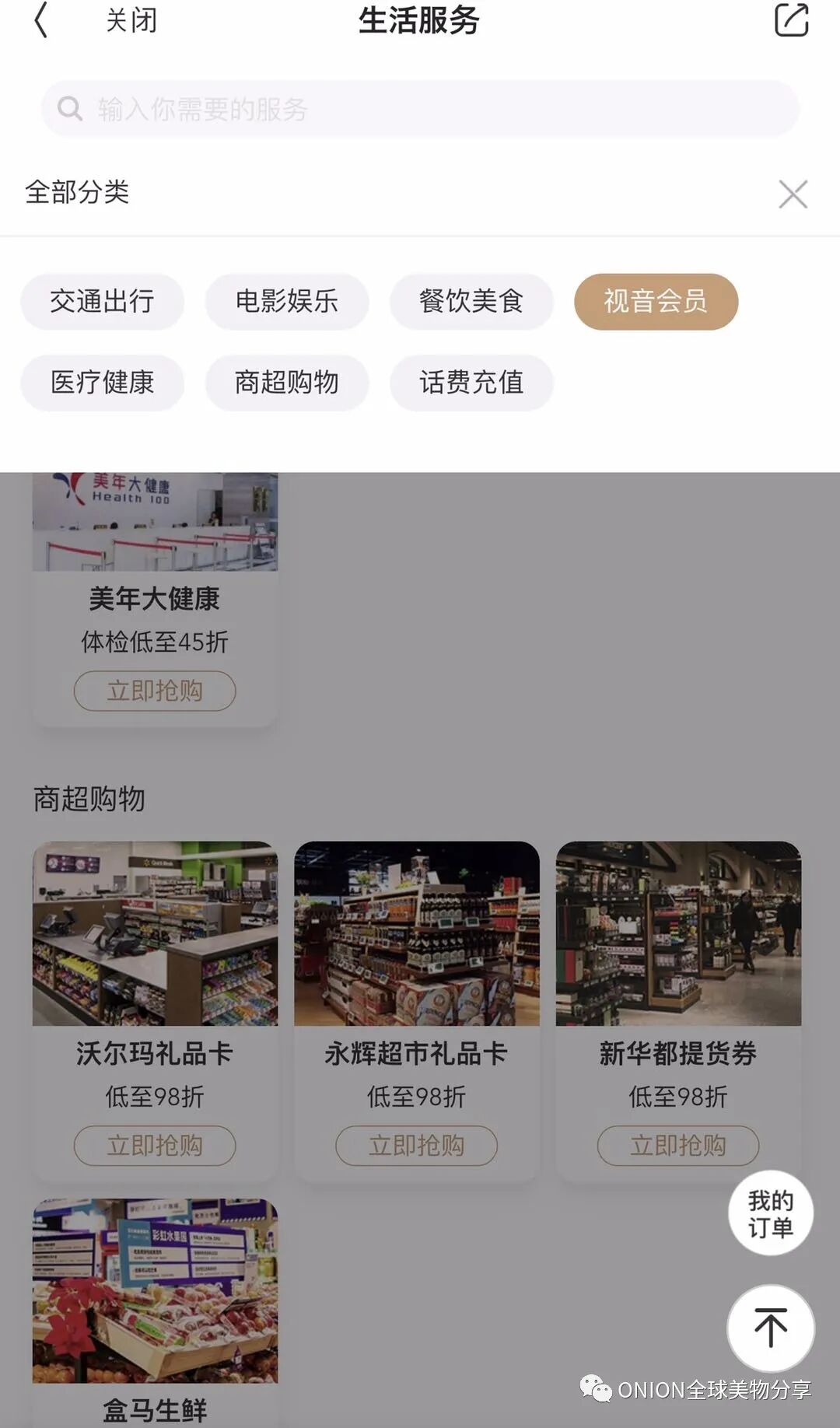 机票,火车票,酒店预定;美年大健康享45折;加油服务,最高降2.7元/ 升(各车主一年油费就能省几千甚至更多);各商超、肯德基、必胜客等餐饮类礼品卡等,还有话费充值、视音会员等总共七大类#生活服务#