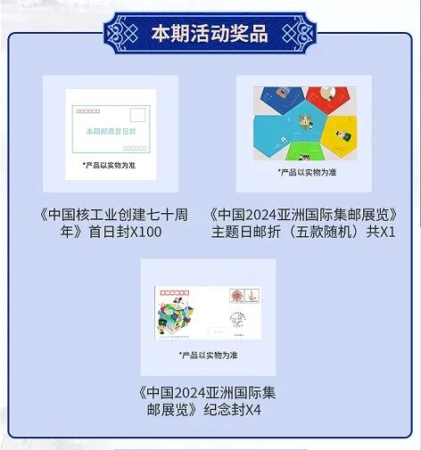 本次邮票数字化活动继续奖品大放送!我们准备了《中国2024亚洲国际集邮展览》主题日邮折(五款随机)、《中国2024亚洲国际集邮展览》纪念封和《中国核工业创建七十周年》首日封等丰富奖品赠送~