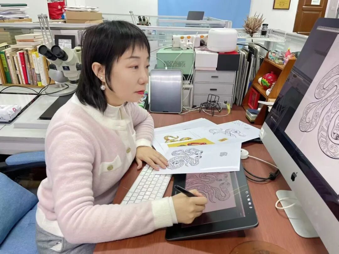 根据邮票设计师的设计稿,我们通过雕刻线让设计稿锦上添花,让邮票更加精美。以蛇年生肖邮票来看,我想通过线让画面中的蛇焕发生机与活力,增强立体感和律动感,使设计更加生动丰富。在探索过程中,我发现雕刻想法与中国画白描技法相通。借鉴白描技法中线条的粗细变化和顿挫感,再次对雕刻线条进行调整。最后考虑到邮票胶雕结合的工艺特点,我又对点线进行全面调整。有些线条过于密集,缩小后难以看清色彩,我巧妙处理空隙,使线条在邮票上呈现恰到好处的视觉效果。正是这样反复的推敲与调整,才成就了这套《乙巳年》生肖邮票雕刻作品。