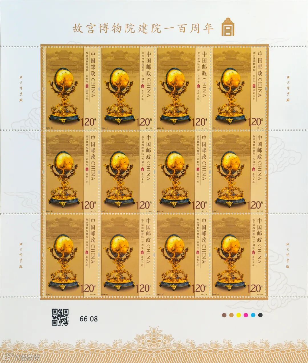 边饰使用特种金属质感油墨,上方的标题和宫标与下方的海水江崖图案相得益彰。在紫外灯照射下,荧光效果在提升邮票防伪性能的同时,提高了邮票的美观性。