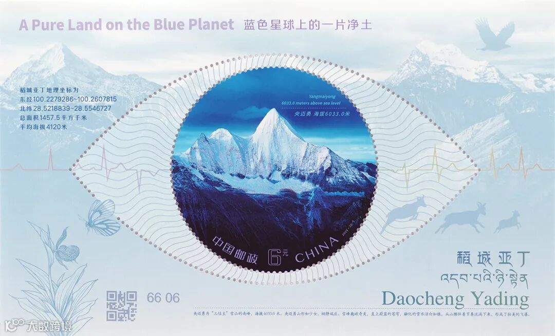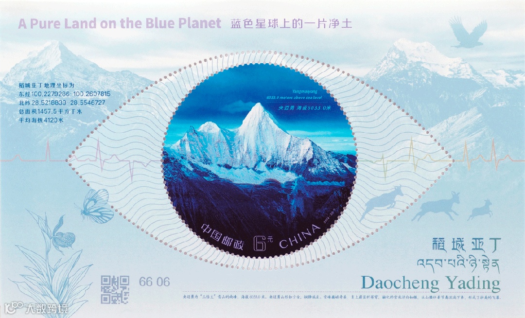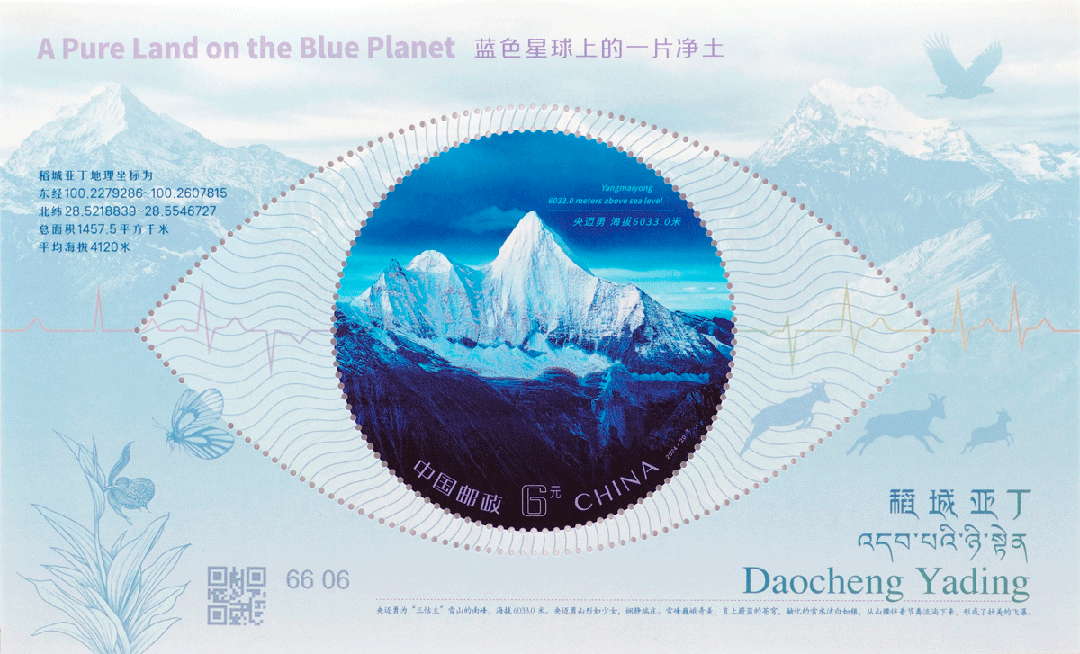 小型张“央迈勇”为“三怙主”雪山的南峰,海拔为6033.0米。央迈勇山形如少女,娴静端庄。雪峰巍峨奇美,直上蔚蓝的苍穹,融化的雪水洁白如银,从山腰伴着节奏流淌下来,形成了壮美的飞瀑。小型张以眼睛为主造型,瞳孔中看到了稻城亚丁雪山与湖泊的美景,背景则衬托了稻城三神山的全景图,边饰部分绘制了稻城的珍稀动植物。