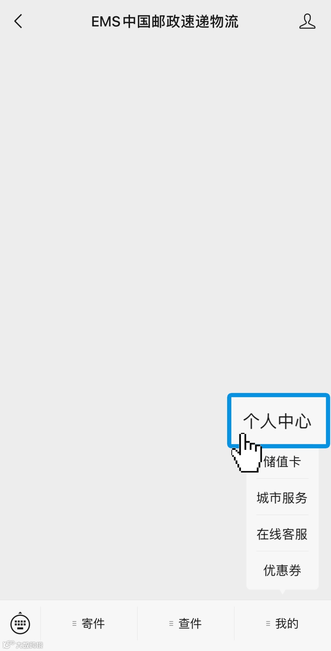 点击EMS公众号菜单栏「我的」-「个人中心」。